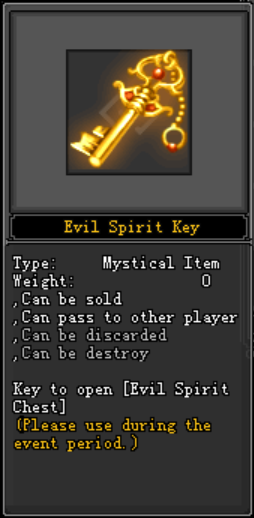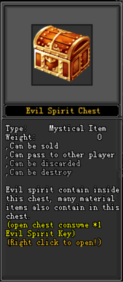 អ្នកកម្សាន្តអាចបើក Evil Spirit Chest បានតម្រូវអោយមាន Evil Spirit Chest x1 បន្ទាប់ពីអ្នកកម្សាន្តបំបែក Evil Spirit Chest នេះ នឹងទទួលបានភ្លាមៗ៖