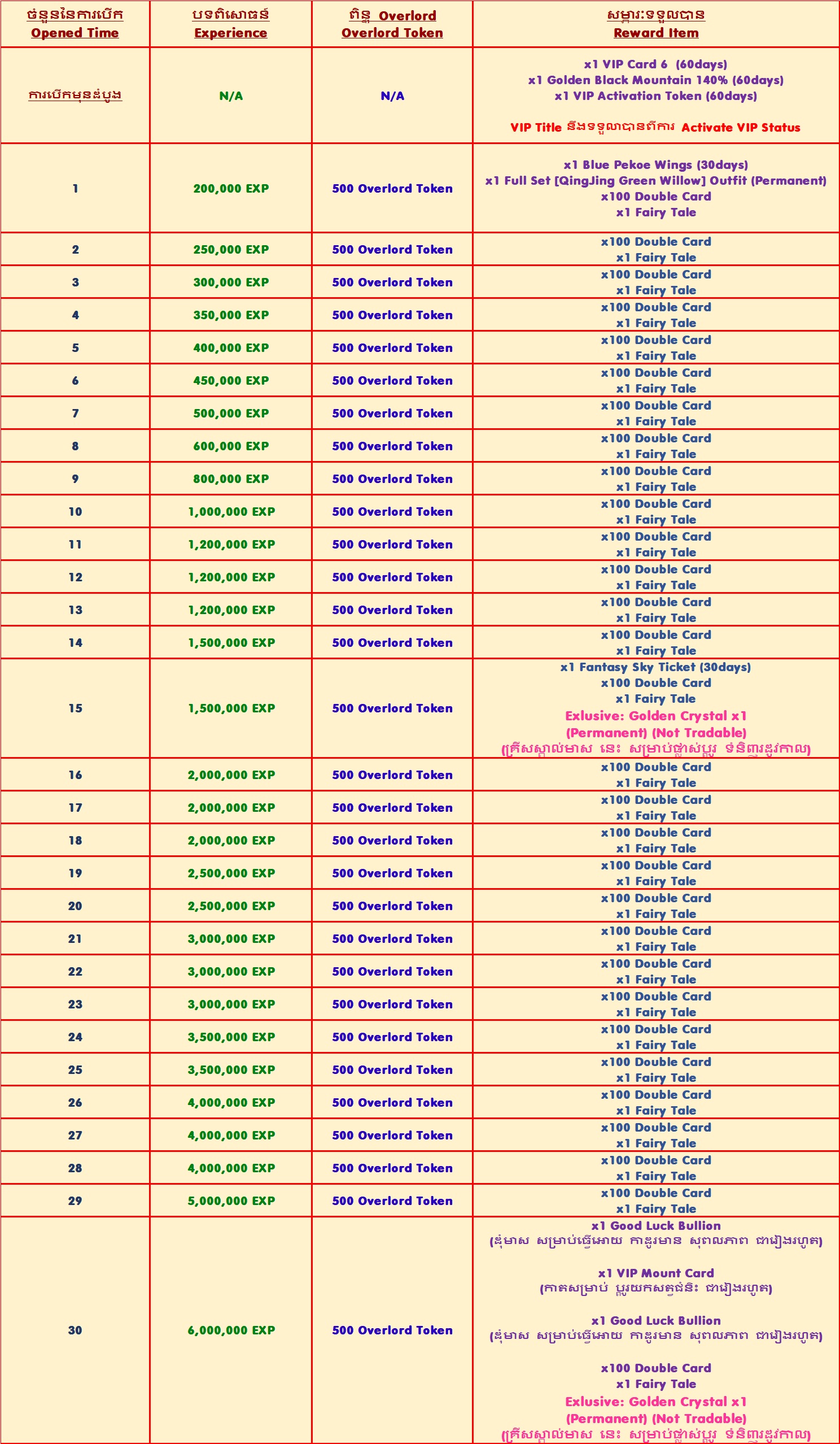 - បន្ទាប់ពីបើក "VIP Gift Box" ជាលើកដំបូងនឹងទទួលបាន "VIP Card" ចំនួន ១សន្លឹក និង រង្វាន់.